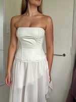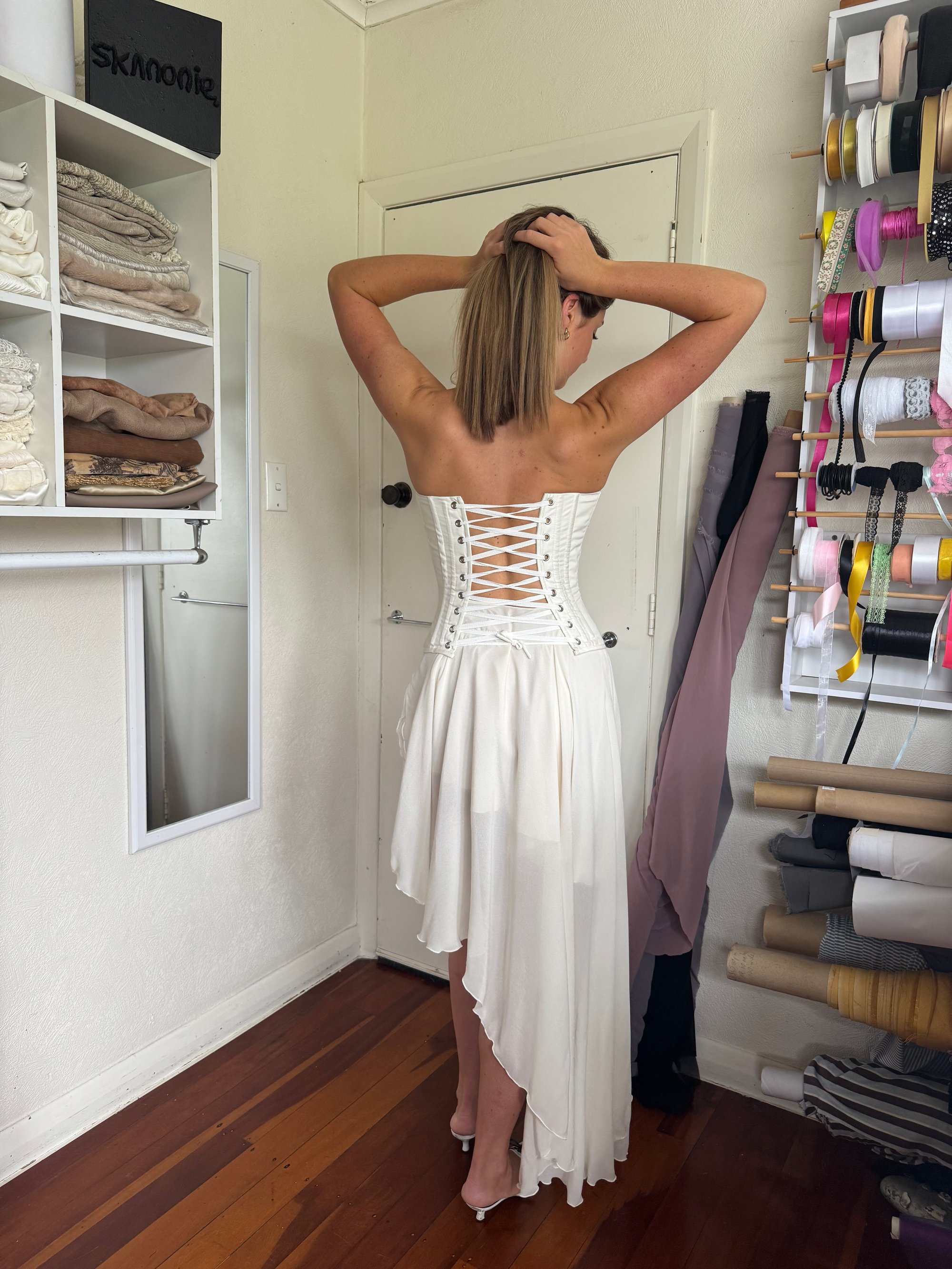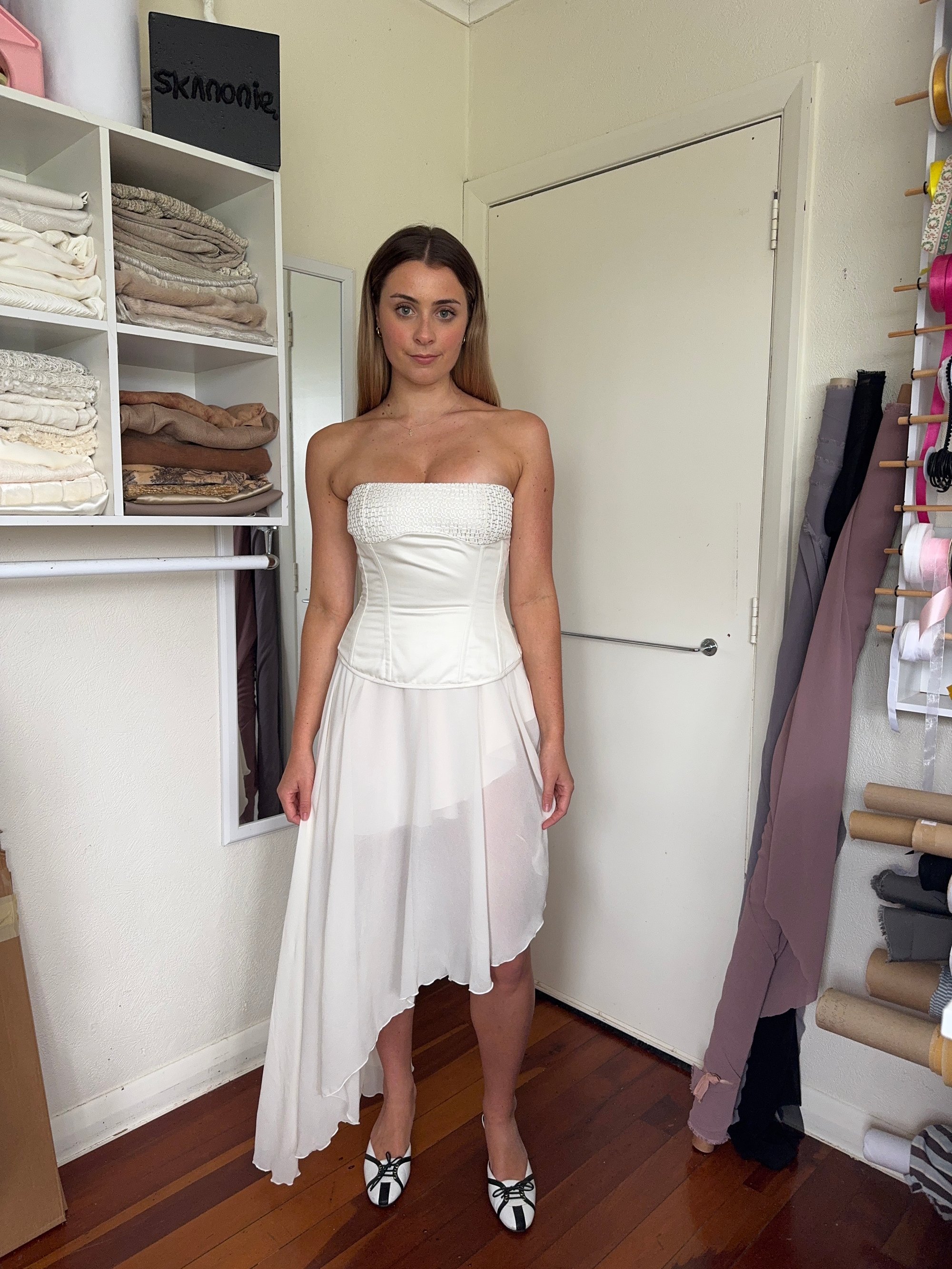 A cream asymmetrical skirt is available to rent with this corset.