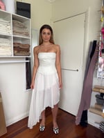 An ivory, structured corset top with a contrast panel detailing, with the option to rent a skirt. This is one-of-a-kind piece, made from repurposed materials, and is available to rent for events or special occasions.